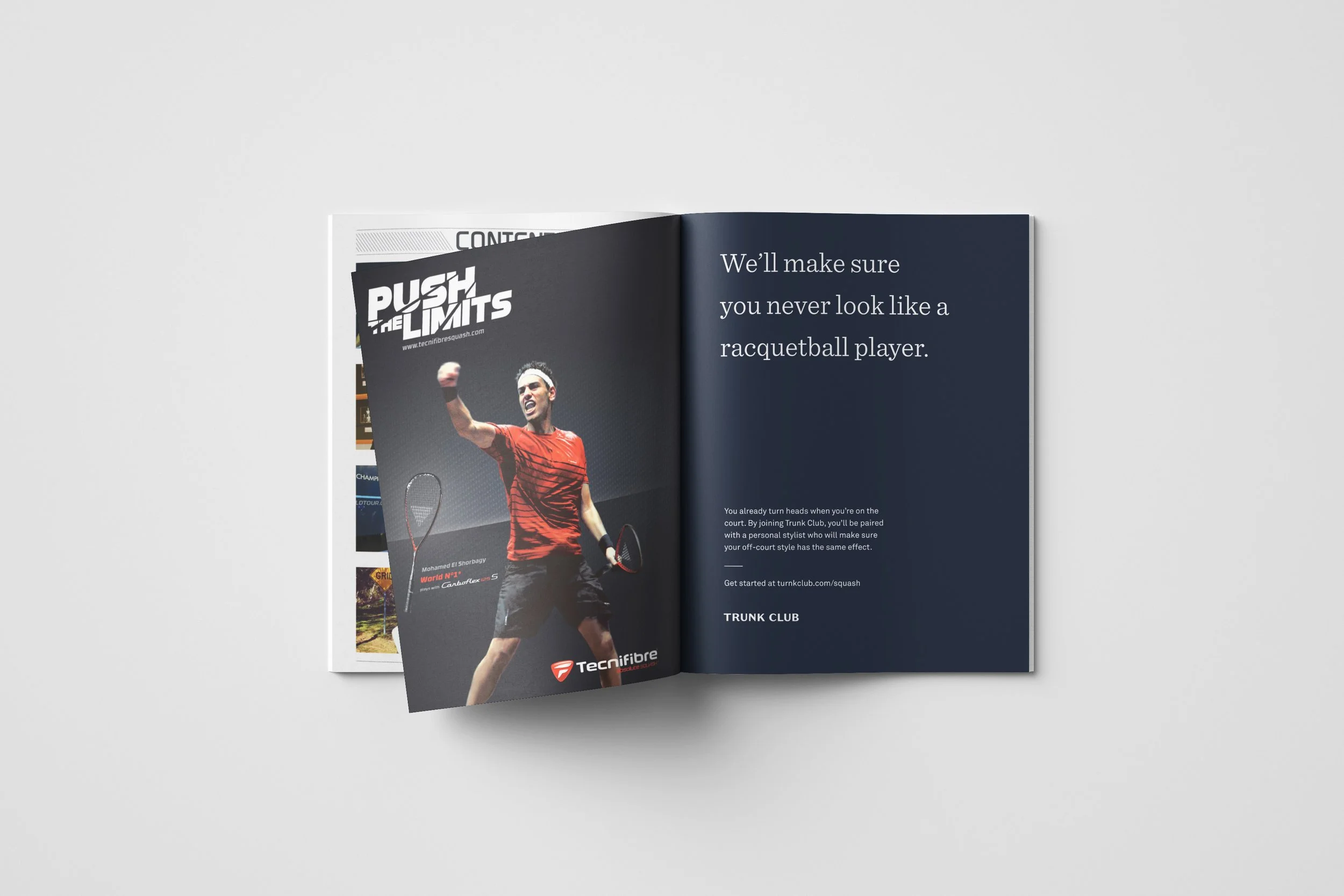 My first real ad ran in Squash Magazine—small audience, huge opportunity to write something hyper contextual. I didn’t know anything about squash before writing this ad but, with a little research, I learned that the squash community looks down on racquetball players. For a service , this was the perfect bit of psychology to tap into.